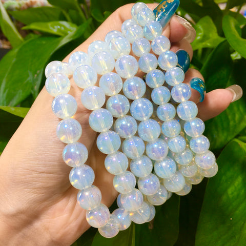 Wrap your wrist in celestial magic with this Angel Aura Opalite Bracelet, featuring ethereal 8mm or 10mm beads that shift between opal-blue, lavender, and pearl-white like frozen moonlight. Each 25g strand combines durable man-made opal glass with permanent platinum coating for lasting iridescence.