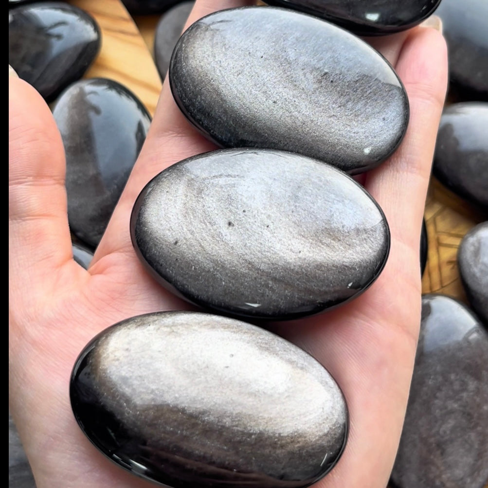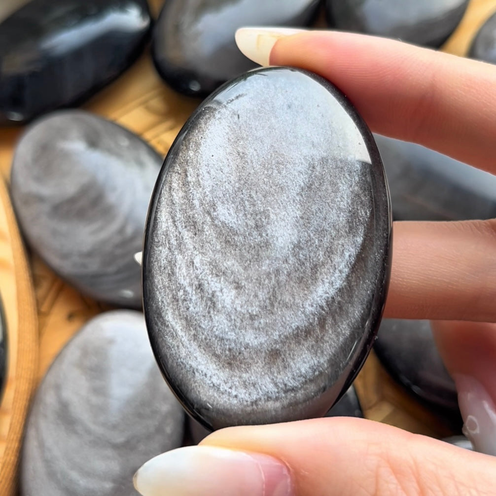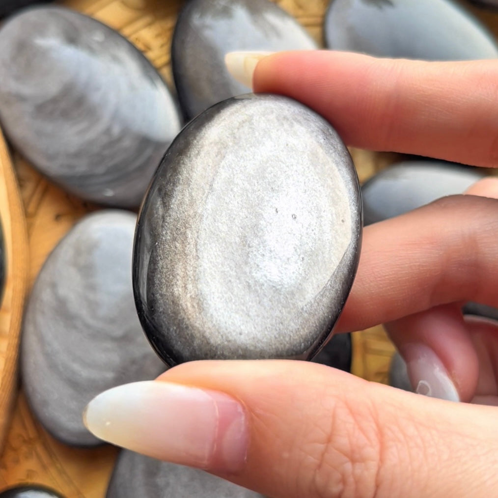 Silver Obsidian Palm Stone – Mirror of Inner Truth (75g | 5-7cm) – Polished Volcanic Glass for Shadow Work & Psychic Protection