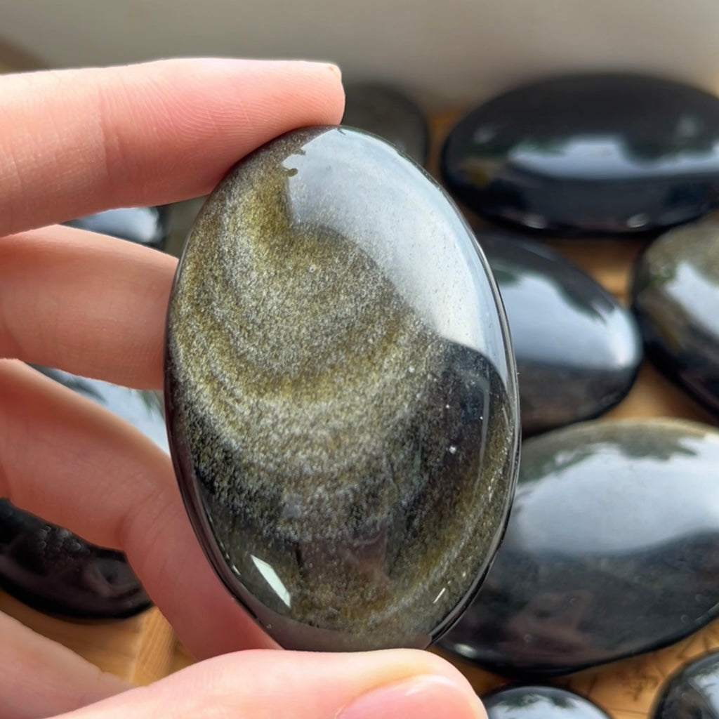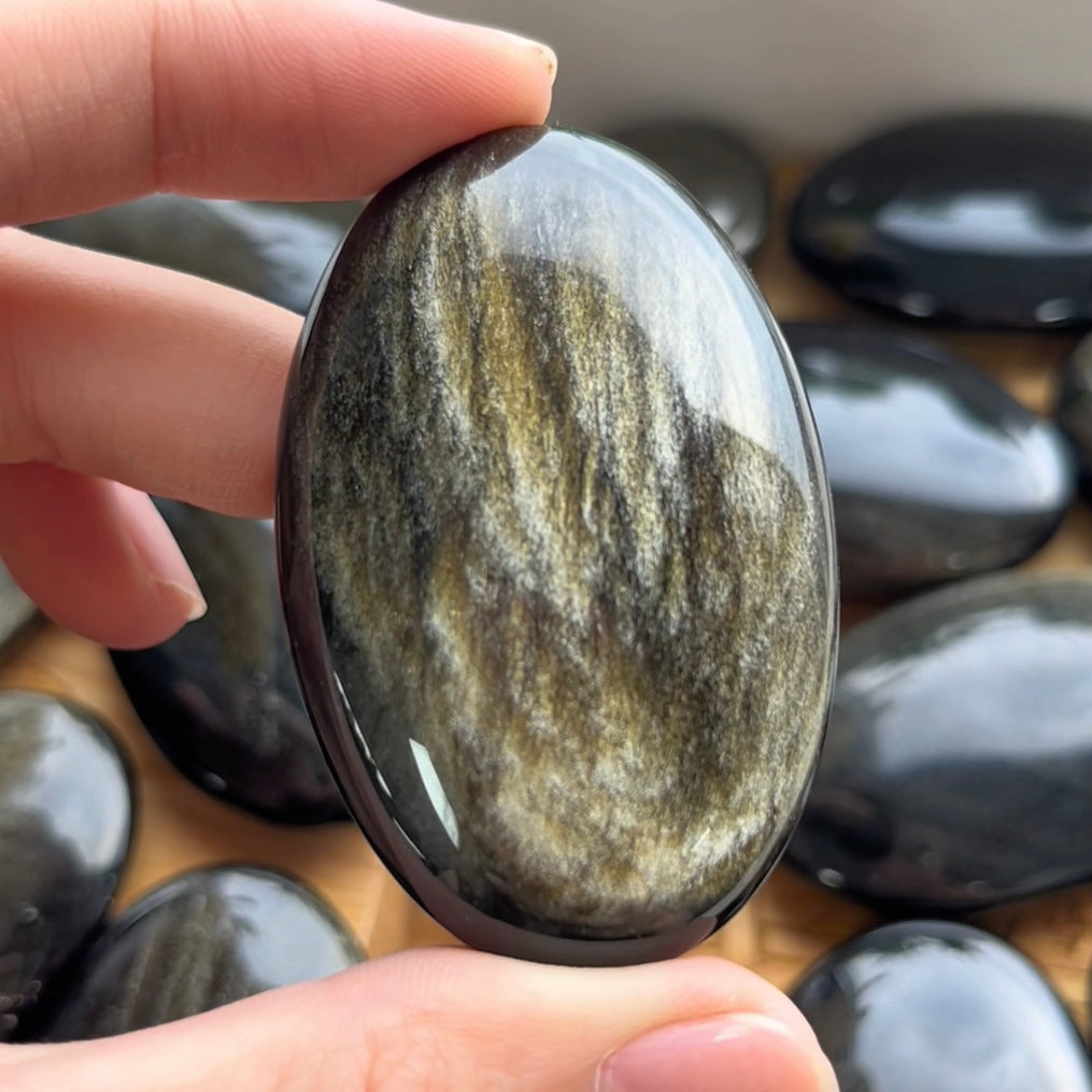 Harness the sun's molten energy with this Golden Obsidian Palm Stone—a 75g (5-7cm) hand-polished disc where glossy black volcanic glass erupts with natural golden pyrite constellations. This rare variety of obsidian merges grounding protection with solar plexus activation, creating the ultimate talisman for entrepreneurs, leaders, and alchemists.