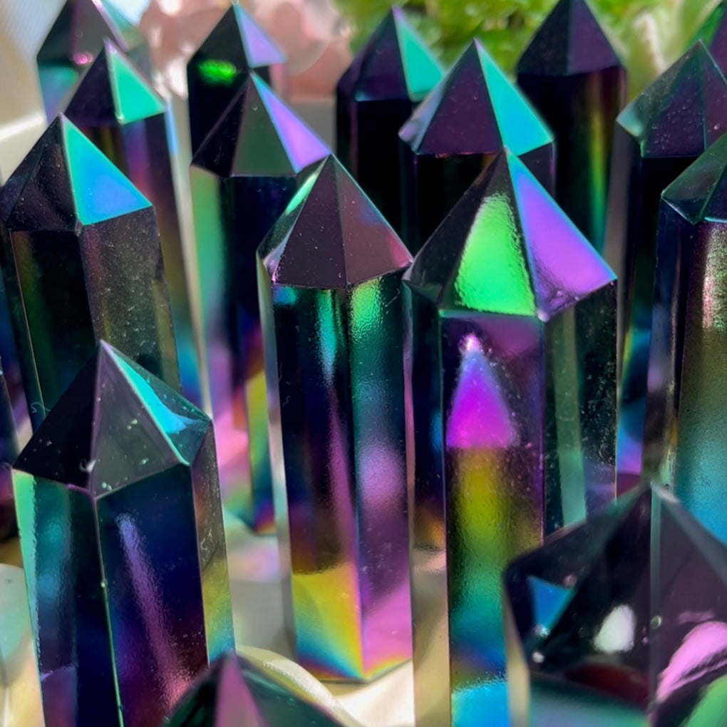 Arm yourself with celestial protection—this Aura Black Obsidian Tower is an 80g (6-9cm) polished black generator crystal, enhanced with permanent titanium coating that shimmers with interdimensional violet-blue sheens. Where volcanic grounding meets futuristic energy tech, this tower becomes a portal guardian, truth revealer, and EMF shield for modern mystics.